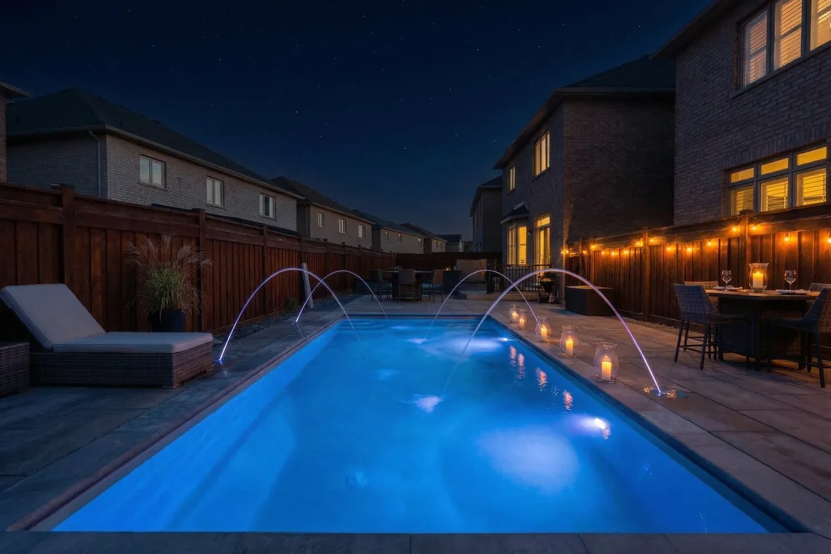 The finished project delivers a 12' × 26' fiberglass pool surrounded by premium Fontaine's interlock stone, with four Luminar LED deck jets that arc water into the pool and glow at night. The compact footprint freed up the backyard for a dedicated basketball court — giving the family a resort-quality pool area and a sports zone in one cohesive design.